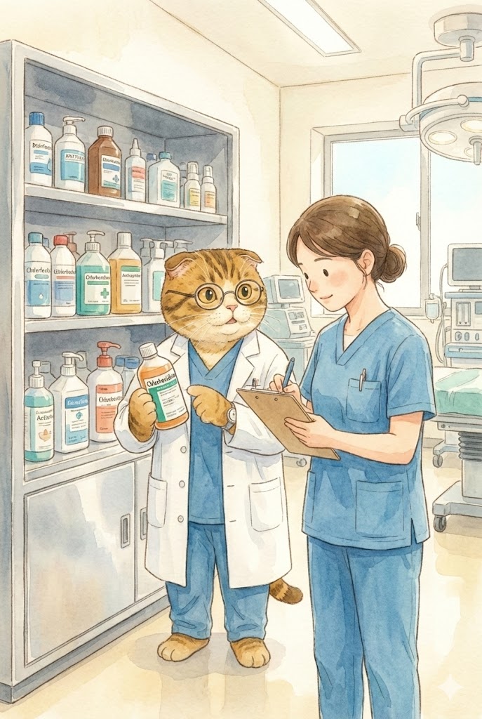 当院のインシデント・アクシデントレポートで手術室内でのクロルヘキシジンの用途間違えの報告があった。インシデント・アクシデントレポートの内容を分析すると濃度が異なる消毒薬の取り間違えが起こったと申請者は考えた。環境感染ラウンドを実施し申請者が消毒薬の管理方法を確認すると同成分の異なる濃度の消毒薬が隣同士でまとめて管理されていた。